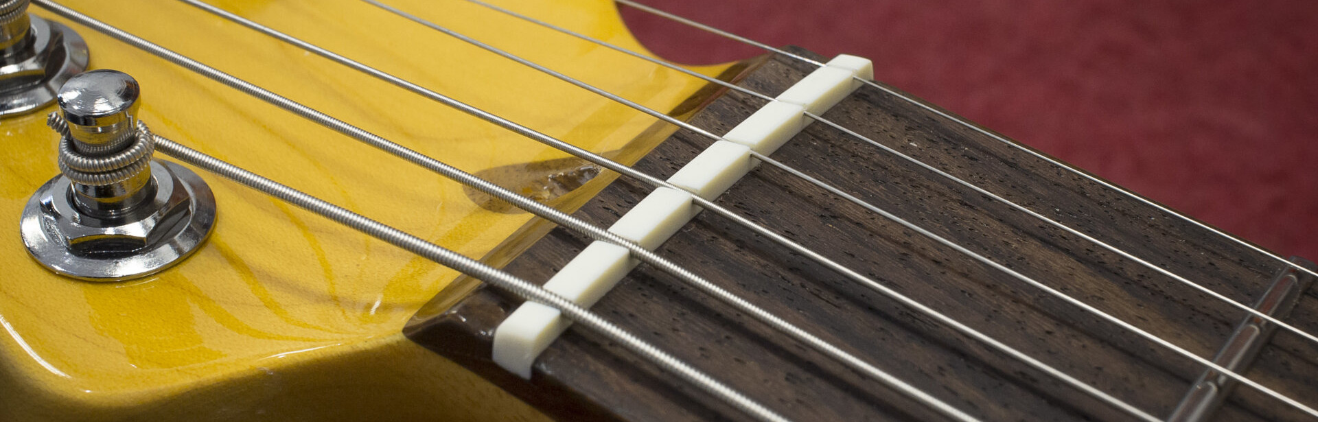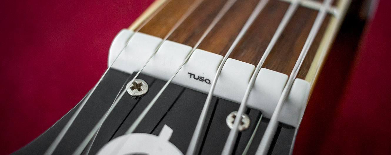 Wymiana siodełka – TUSQ XL – Samosmarujący materiał TUSQ XL, patent od firmy GrapchTech. Tworzywo to spełniała wymagania co do twardości, jednorodności materiału, brzmienia, minimalnego współczynnika tarcia (strun o siodełko podczas gry) etc. Z TUSQ XL pozostałem na lata, ponieważ pośród wszystkich przetestowanych przeze mnie materiałów, to właśnie ten okazał się najlepszy. Zaraz obok progów, siodełko gitarowe jest elementem absolutnie krytycznym, mającym decydujący wpływ na całą gitarę, jej strojenie na progach, utrzymywanie stroju, oraz akcję strun. Gitarzyści w większości przypadków nie zdają sobie z tego sprawy jak ważny jest to element i najczęściej na niego nie zważają, a to błąd!