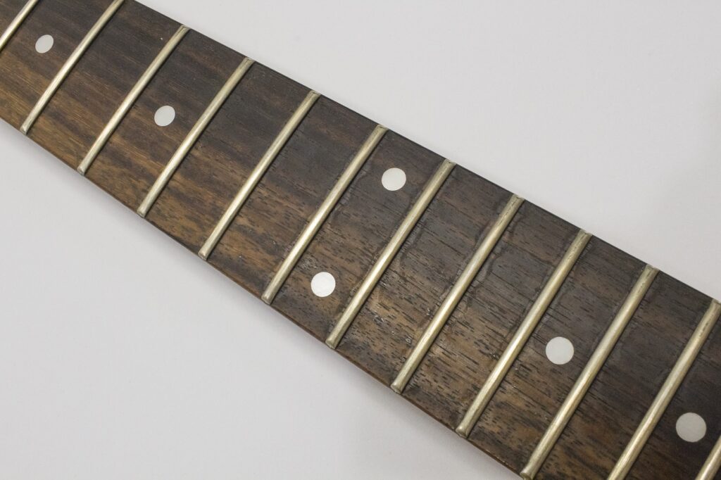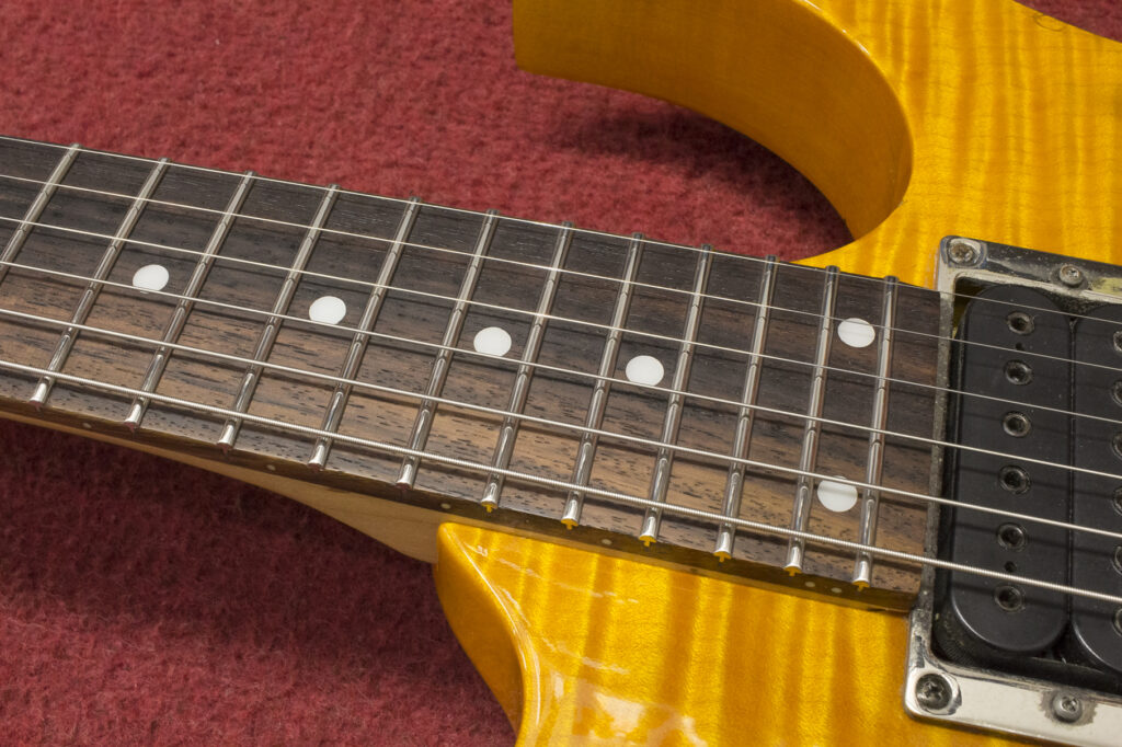 Zacznijmy więc od wyboru gitary. Do kwoty 1500 / 1700zł na rynku wtórnym możemy wybierać i przebierać w większości popularnych konstrukcjach. Nie mamy tutaj w zasadzie żadnych ograniczeń ponieważ progi założyć można do każdej gitary, a więc Les Paule, gitary akustyczne, wszelkie instrumenty z wklejanym gryfem lub gryfem przez deskę, kwalifikują się do przerobienia. Akurat trafił się ciekawy model Ibaneza RG320FM z wykręcanym gryfem, oraz dwoma popularnymi w tamtym okresie humbuckerami INF3 i INF4. Taki „silnik” zapewni wysokiej jakości brzmienie i dynamikę, która z pewnością będzie dobrze współgrać z nowymi progami ze stali nierdzewnej. Chciałem zaprezentować właśnie tą gitarkę, jako przykład świetnie zachowanego instrumentu, które grzecznie leżało sobie w domu w sypialni u poprzedniego właściciela. Lakier jak i cały osprzęt jest w bardzo dobrym stanie. Chciałem zaznaczyć, że przeglądając rynek wtórny, nierzadko można natrafić na takie gitarki, naprawdę warto brać!