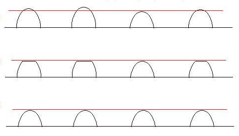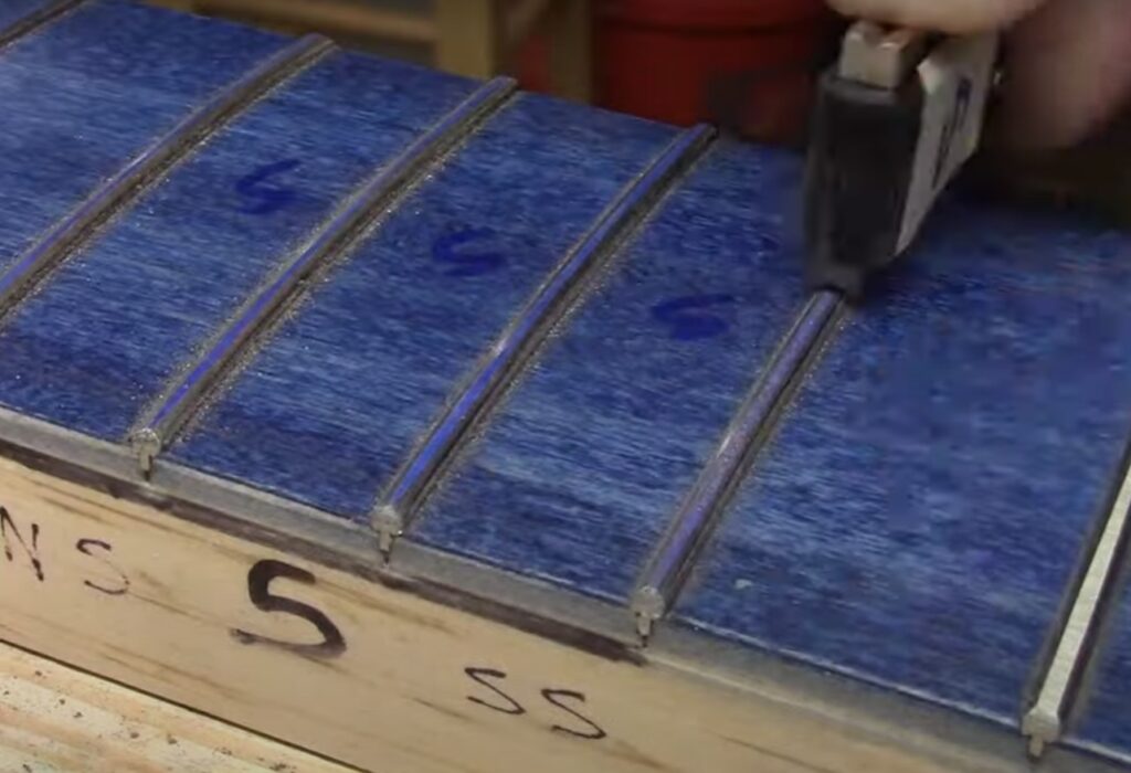 Obróbka progów z wypaczoną podstrunnicą. Zwróć uwagę na środkową strefę gryfu, tutaj progi wymagać będą głębokiego szlifowania aby uzyskać równą linię na szczytach.