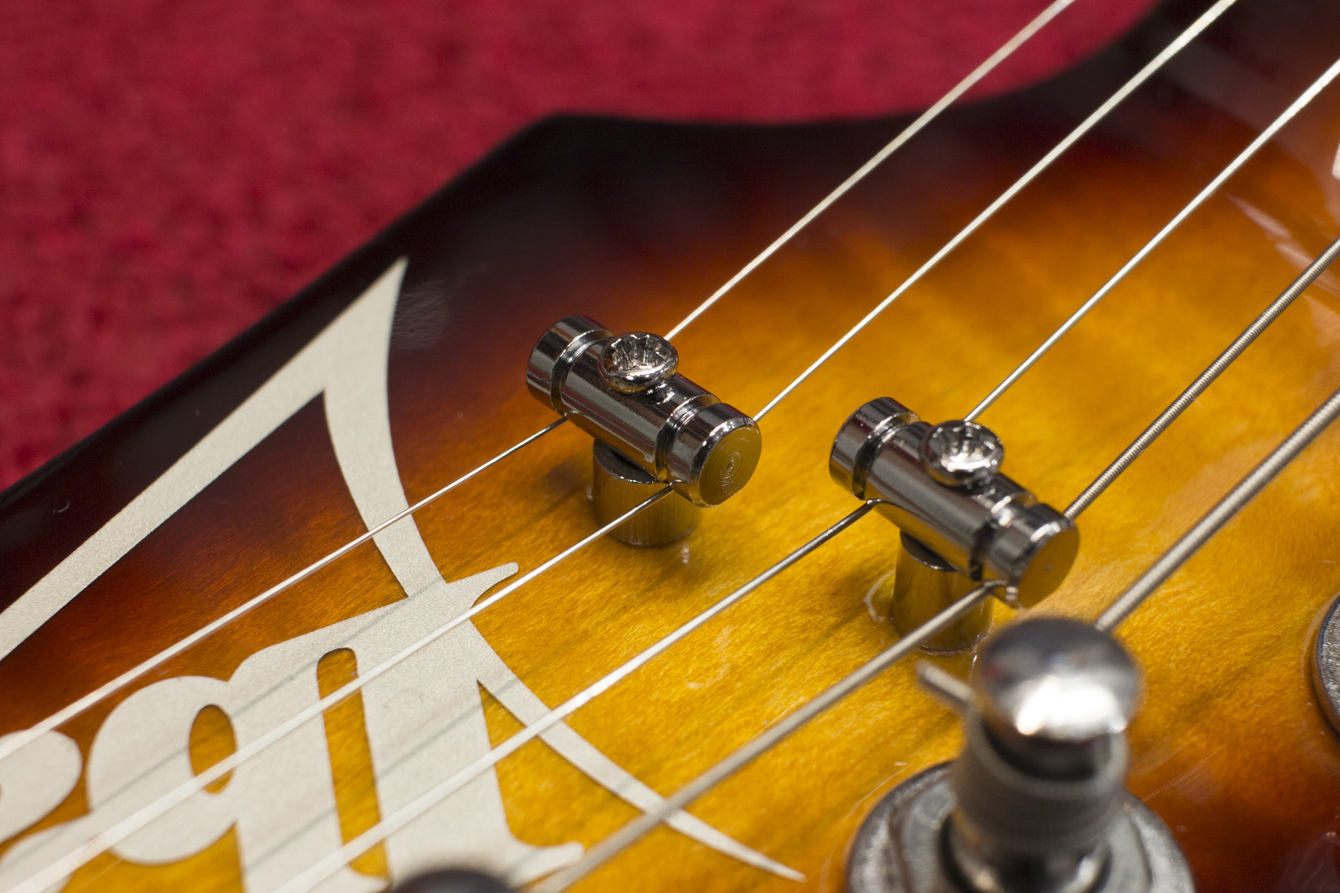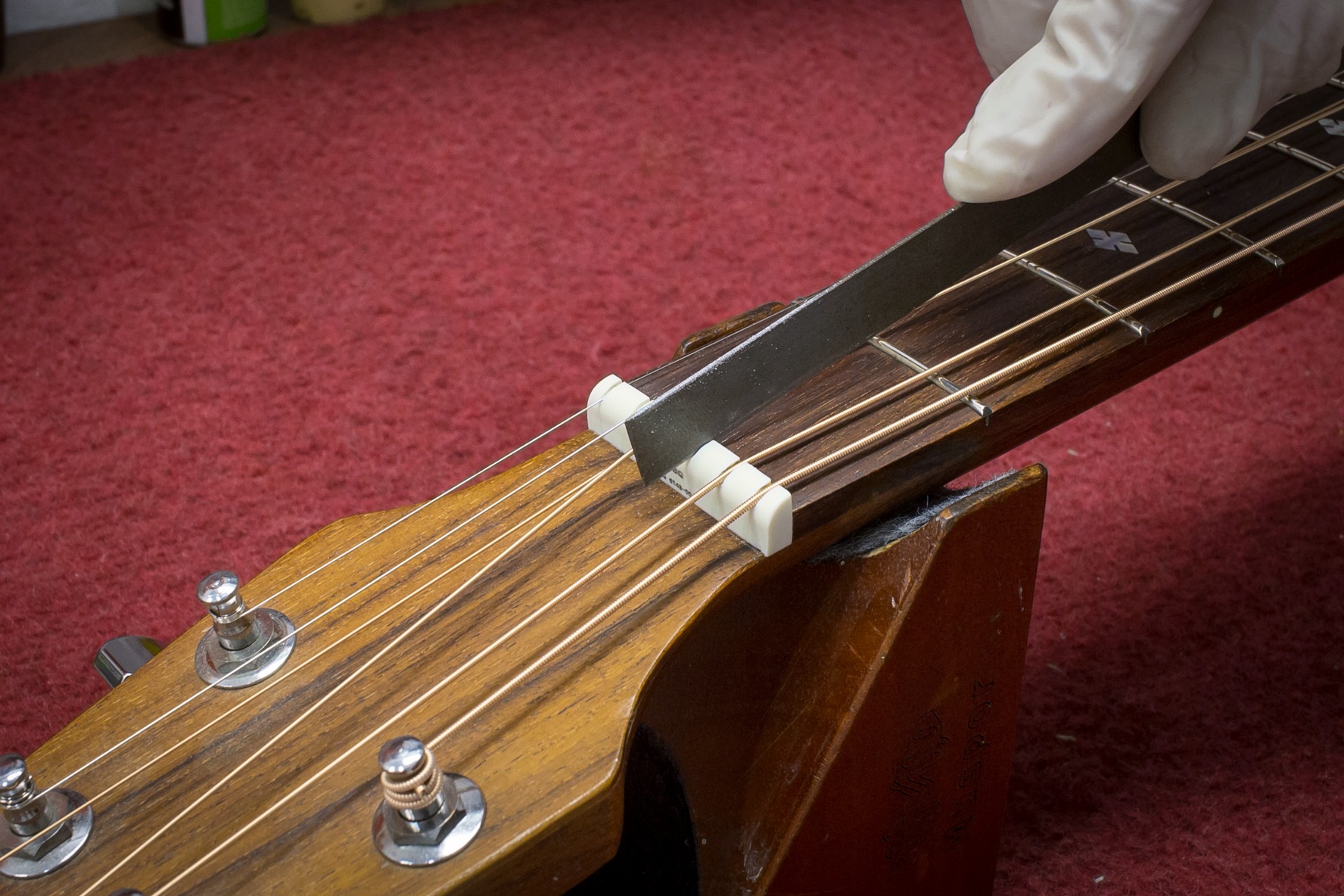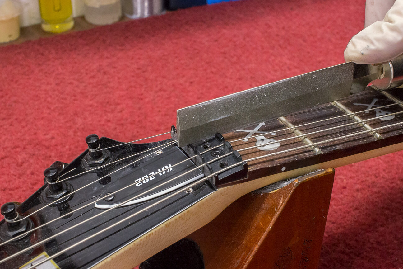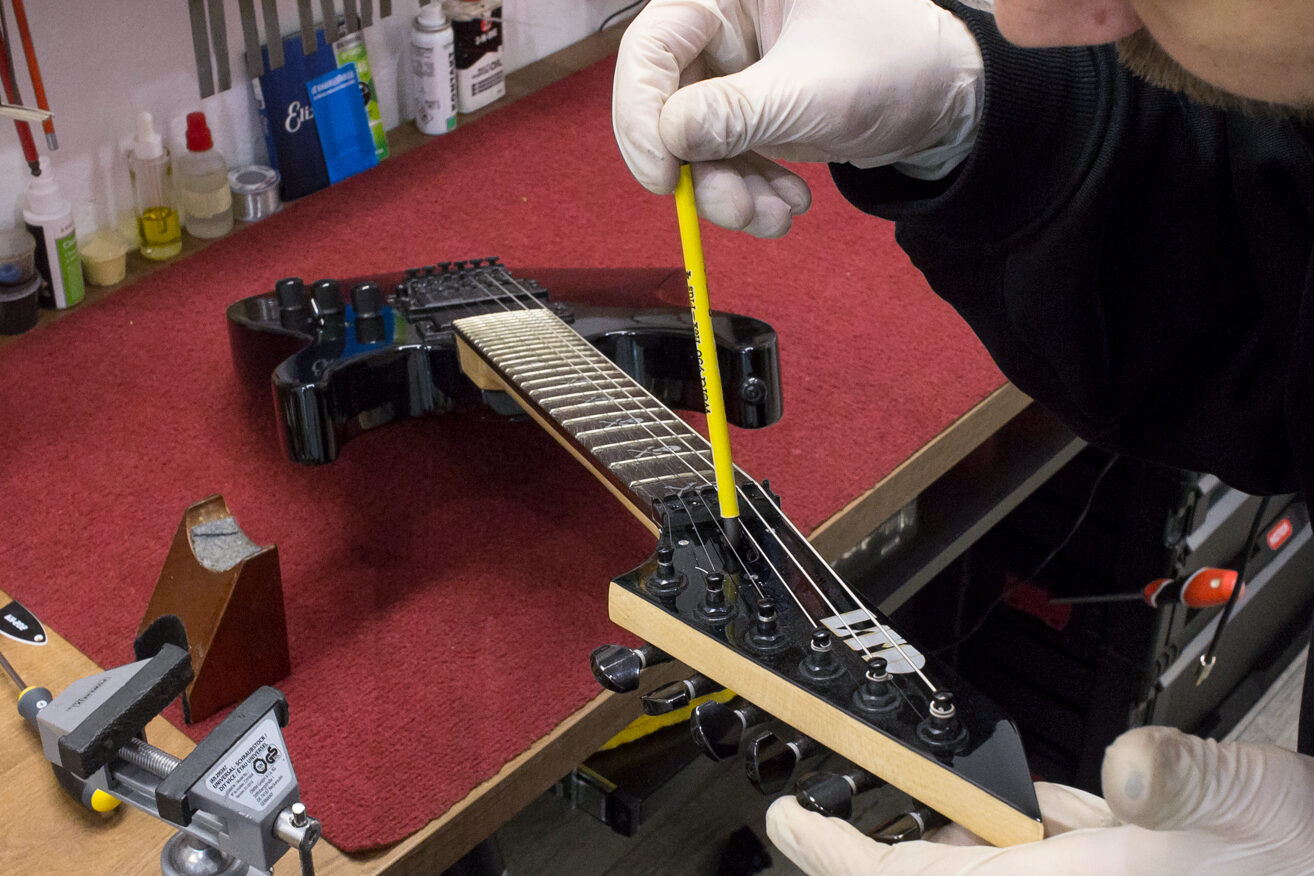 Na wyczyszczoną i wypolerowaną gitarę zakładam struny i przystępuję do obróbki siodełka. Krok ten polega na korekcie rowków w której spoczywają struny. Formuje się je specjalnymi pilnikami na odpowiednią głębokość i kształt. Wspomniane rowki muszą być odpowiednio wyprofilowane, by idealnie współgrały ze strunami i minimalizowały efekt tarcia strun o siodełko. W ten sposób ustawiamy minimalną akcję strun na progu tzw. „zerowym”.