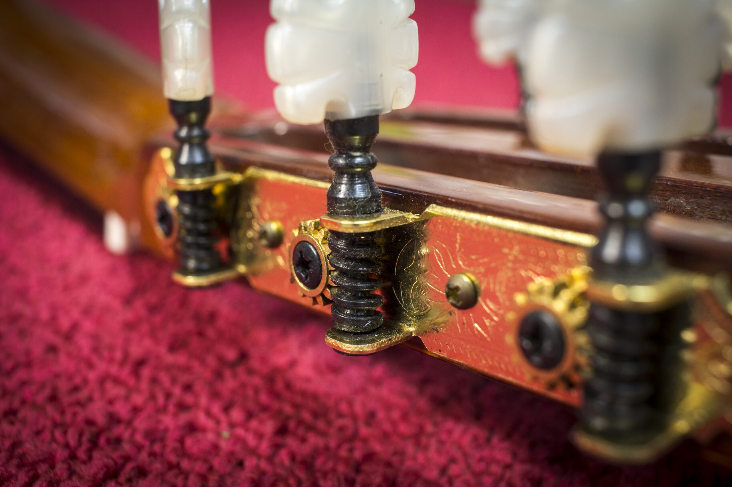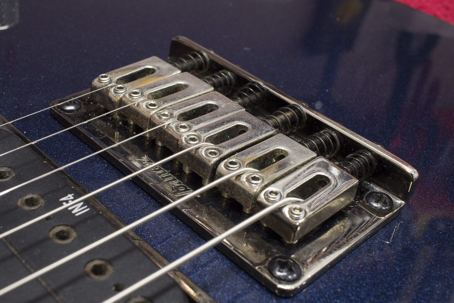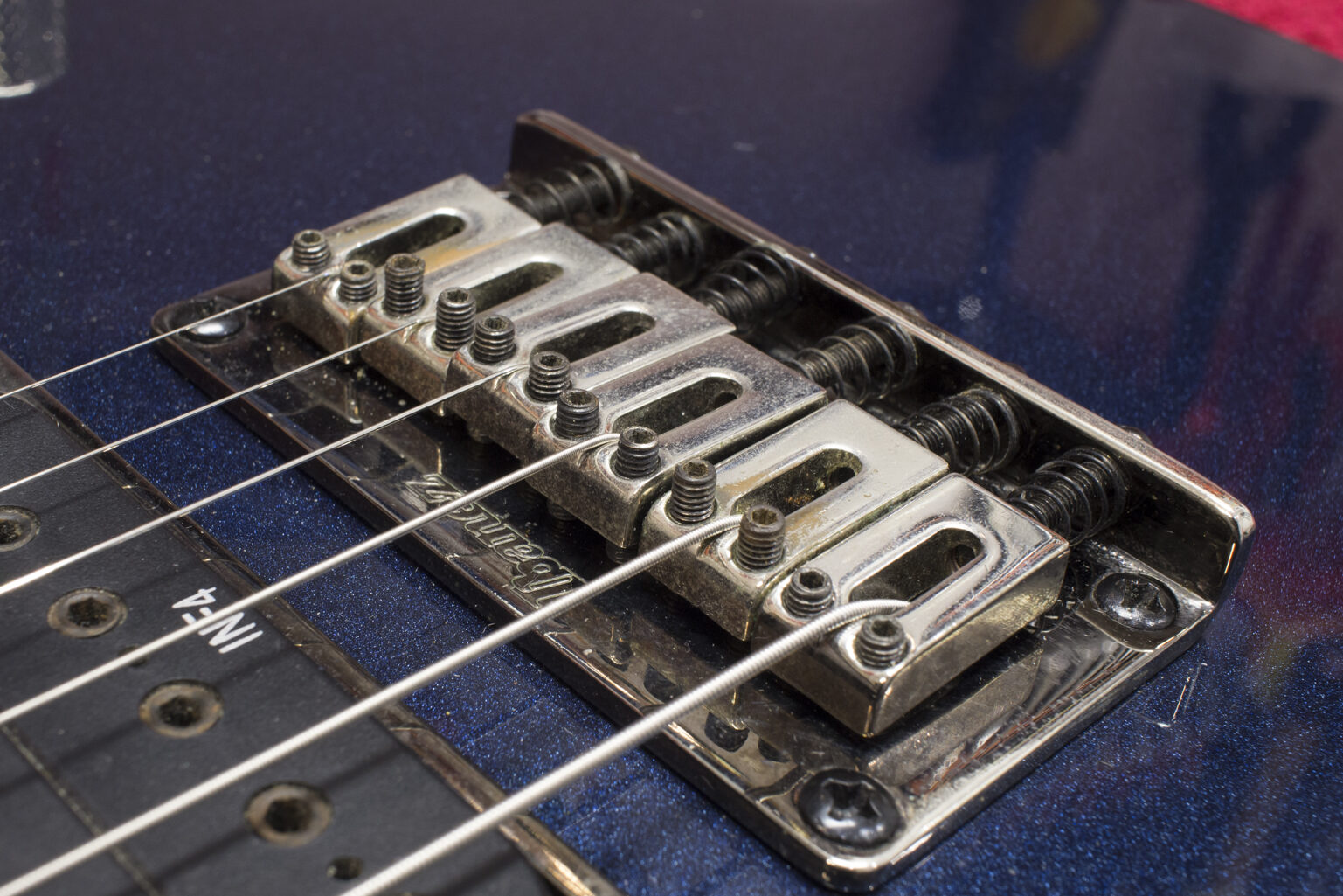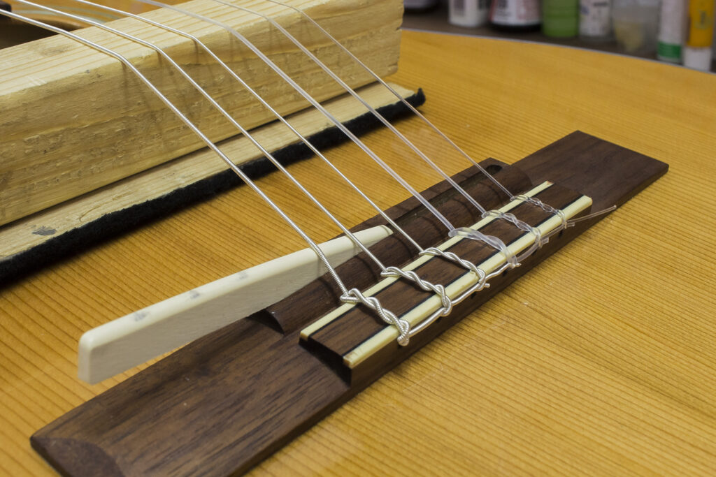 Na wyczyszczoną i wypolerowaną gitarę zakładam struny i przystępuję do obróbki siodełka. Krok ten polega na korekcie rowków w której spoczywają struny. Formuje się je specjalnymi pilnikami na odpowiednią głębokość i kształt. Wspomniane rowki muszą być odpowiednio wyprofilowane, by idealnie współgrały ze strunami i minimalizowały efekt tarcia strun o siodełko. W ten sposób ustawiamy minimalną akcję strun na progu tzw. „zerowym”.