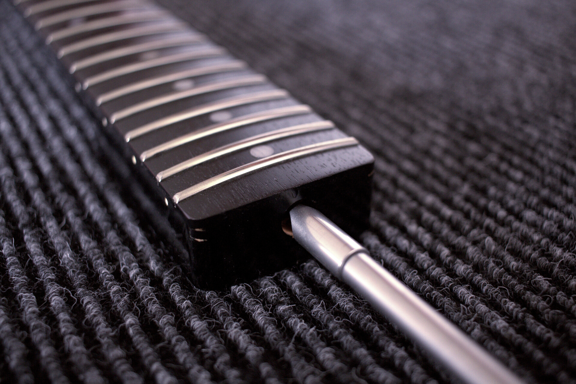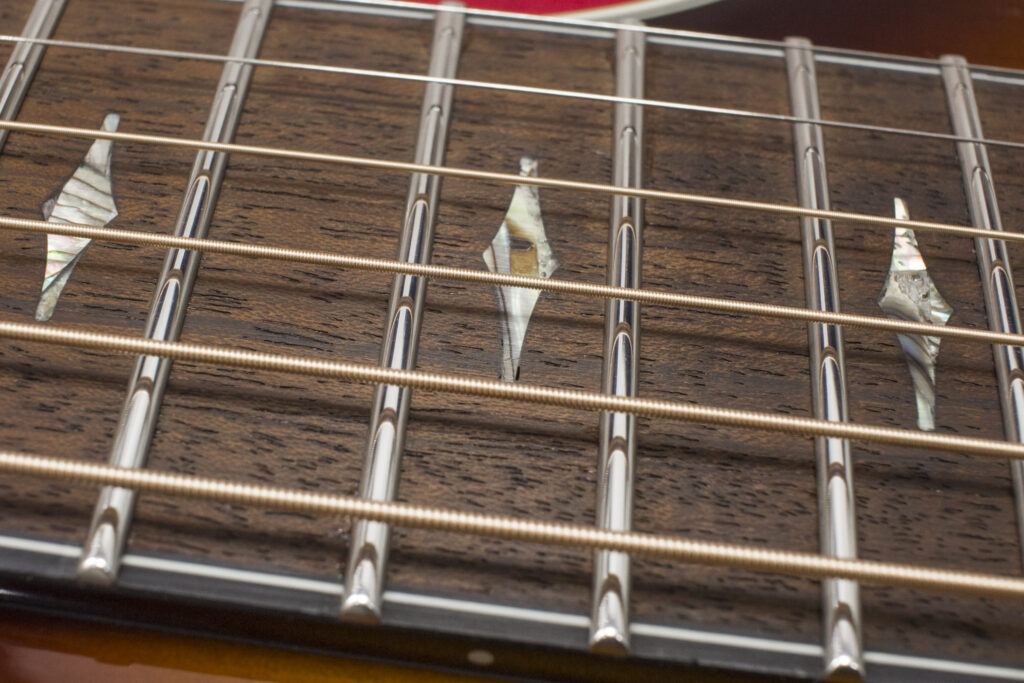 Celem kalibracji jest ustawienie delikatnego łuku na podstrunnicy względem strun. Do sprawdzania, czy taka występuje, świetnie nadaje się struna H2. Po dociśnięciu na dwóch skrajnych progach, tworzy prosty przymiar. Sprawdź sam – pomiędzy struną a progami powinna być minimalna przestrzeń (najlepiej właśnie grubości tej struny H2).