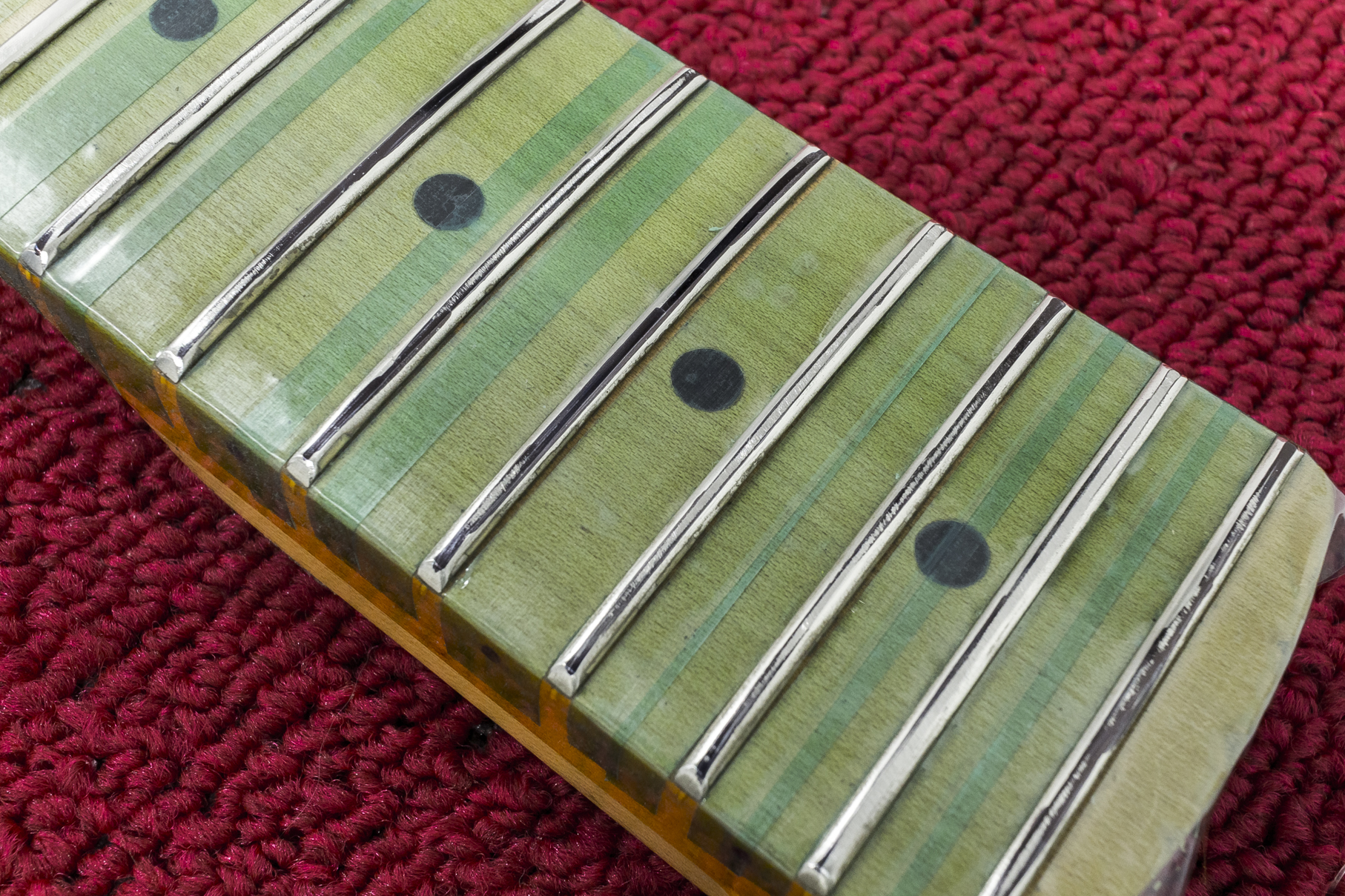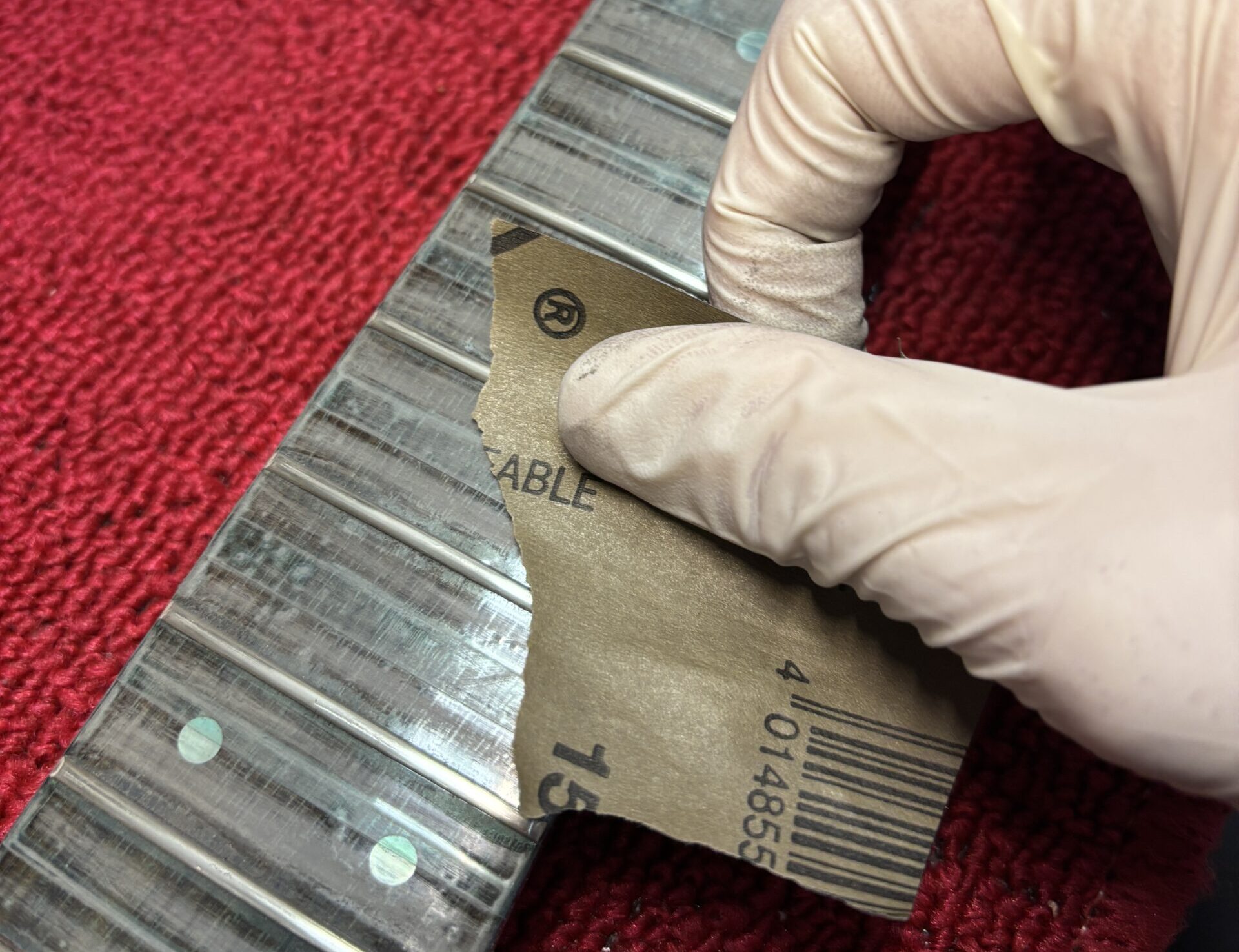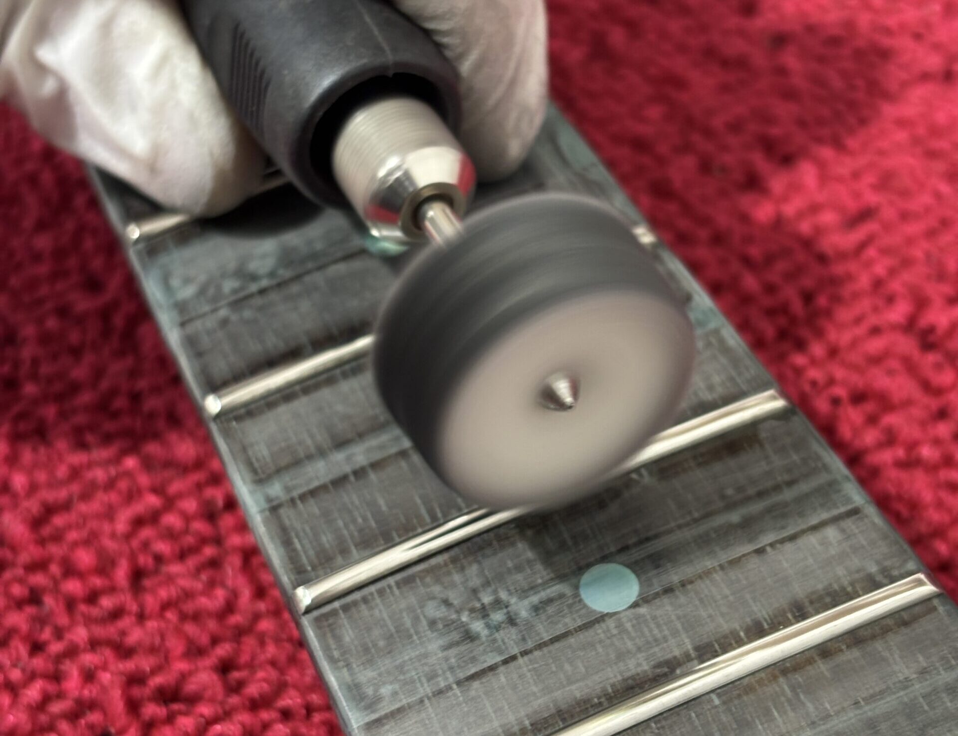 Polerowanie rozpoczynam najpierw papierami wodnymi, zazwyczaj dwiema gradacjami. Przy okazji usunę rysy i wszelkie ślady oksydacji. Następny krok, to polerka „na lustro” filcem z odpowiednią, moją ulubioną – zieloną pastą. W efekcie polerki następuje wyraźna poprawa wizualna oraz w obszarze komforcie grania, struny już nie trą o progi podczas podciągnięć, dźwięki stają się bardziej klarowne, zwłaszcza jeśli progi były mocno zapuszczone. Kolejny plus dla wytrzymałości strun, które pozostaną dłużej świeże i czyste.