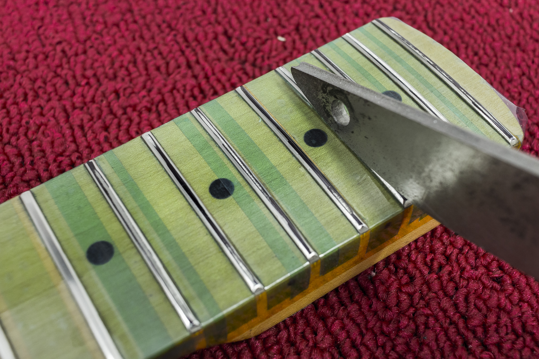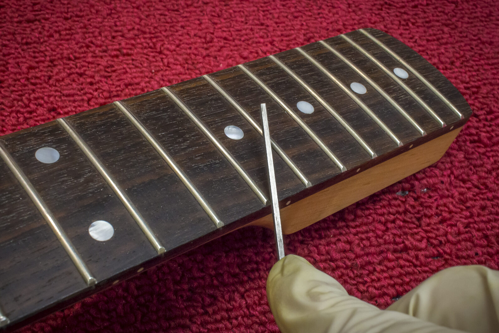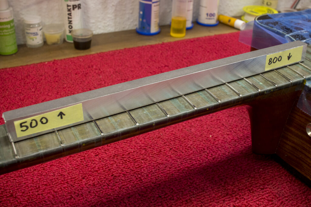 Jeśli chodzi o szlifowanie progów gitarowych to mam duże doświadczenie. Na przestrzeni lat ulepszałem proces. To co mogę powiedzieć na ten temat, to że jest to operacja, która wymaga ślusarskiej precyzji. Zwracam szczególną uwagę na: dobre ustabilizowanie gitary, szyjki, idealne ustawienie reliefu na gryfie, narzędzia (czy są idealnie proste), odpowiednie ścierniwa np. pilniki, czy są precyzyjne, światło – czy odpowiednie bo takie przydaje się podczas mechanicznej obróbki szczytów progów.