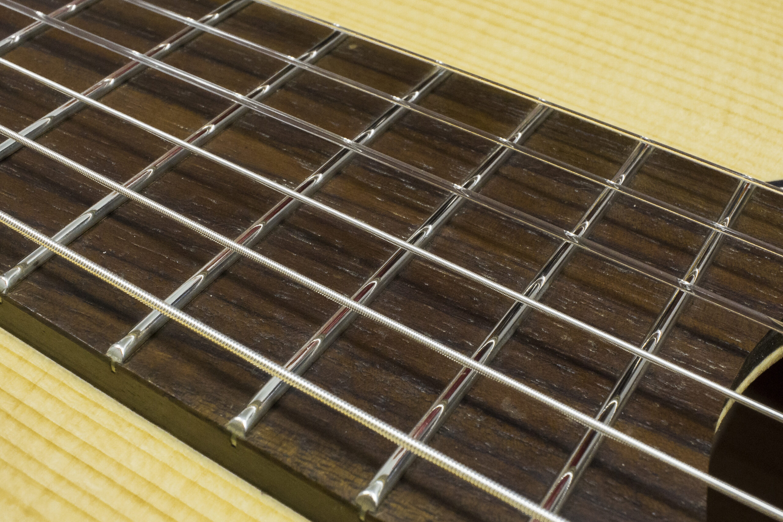 Szlif to znaczny kompromis pomiędzy tym co można by uzyskać, przy okazji wymiany progów na nowe. Zabieg owszem – załatwi część problemów związanych z geometrią jednak nie poprawi samej podstrunnicy, jakości nabicia ani materiału z jakiego progi są wykonane. Z technicznego punktu widzenia szlif jest ratunkiem – poprawianiem czegoś co z założenia jest błędne, więc naturalnie efekt będzie ograniczony jakościowo i zależny od skali występujących nieprawidłowości geometrycznych. Więcej o wadach szlifowania przeczytasz na moim blogu, a tak to wygląda w praktyce:
